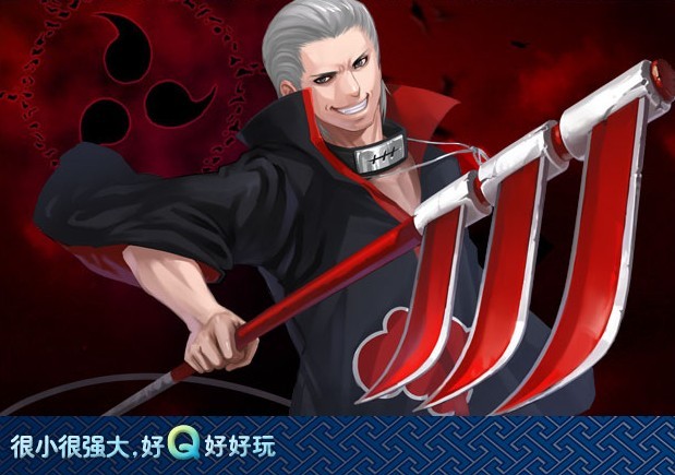 飞段,使用一把三重镰刀,拥有不死之身的邪神教教徒,平时相貌英俊,变身之后却会变得相当恐怖,也算是晓组织中为数不多的没头没脑又富有幽默感的成员。只要舔到他人的血液,身体就会进入邪神状态,并通过用自己的血画成的特殊阵形内,对他人进行诅咒,给对手造成伤害甚至死亡。