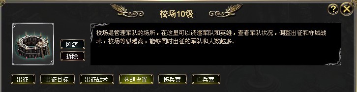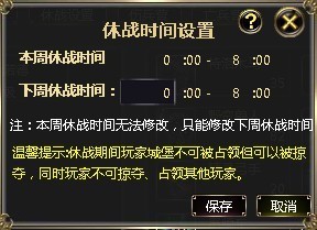 在校场中,可以设置玩家的休战时间,休战默认时间为每日的0点至8点,休战时间修改后,第二周生效。