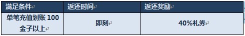 活动时间内,单笔充值划账满100金子,即可得到高额红利返还,一次充值,一次返还!充值越多,返还越多!返还力度高达40%,礼券送不停!更有累积充值奖励哦!重中之重,不设上限!
