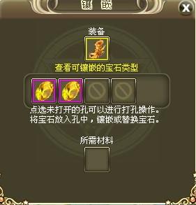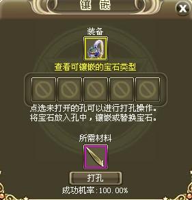 通过镶嵌不同类型的宝石可以给装备带来更强大的属性,而要镶嵌宝石首先必须在装备上带上有可以镶嵌的孔,可以通过打孔道具给装备增加孔数的数量。不同的装备最大孔的数量不同,而且不同装备可以镶嵌的宝石种类也不同。