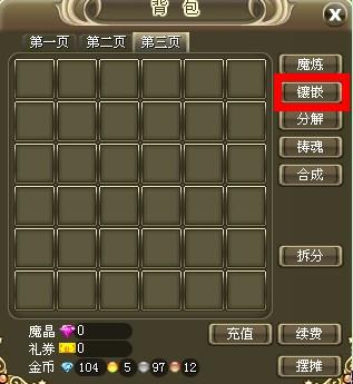 1、打开背包界面,点击镶嵌,放入需要镶嵌的装备