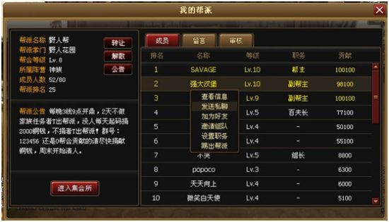 当你达到一定等级后,只需要花费一定的铜钱,玩家可建立自己的帮派。要知道自立门户并非那么轻松,无论是资金还是实力都需要一个坚实的基础,这样才能为你的帮派发扬光大做足准备。有了地盘,就要开始招人了。你可以招很多玩家加入你的帮派,并且协助你一同经营。当你建立好帮派后,输入帮派名称,便成为该帮派掌门。成为掌门,就能够拥有转让帮派、解散帮派、发布帮派公告等权利。这时候大家就一同恭贺你成为大掌门了,祝你飞黄腾达,打遍天下无敌手。