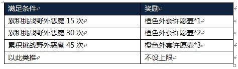 活动期间内,玩家凡挑战野外恶魔达到一定15次及以上,均可获得橙色外套许愿壶*1.