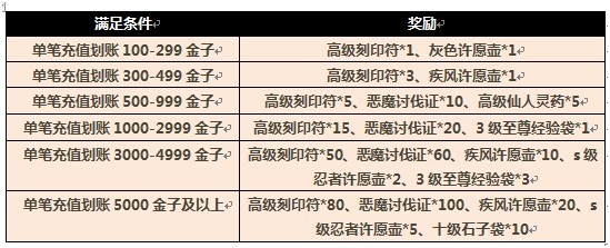 3、单笔充值中 高级刻印符 、S级忍者许愿壶 、恶魔讨伐证 奖励为不绑定;