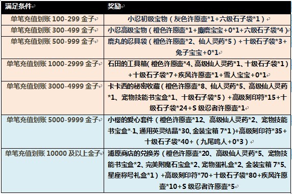 活动期间内首次单笔充值划账300及300以上金子,活动结束后将获得鹿丸的忍具袋(橙色外套许愿壶*2、仙人灵药*5)