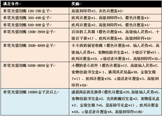 6、领取过火影大礼包的账号无法再次领取新手大礼包。 新手大礼包 技能重置石*1 经验之痕*5 3级强化符*1 3级洗炼符*1 寿司*1 木叶秘药*5 3级附魔符*1 查克拉糖果*1 体力糖果*1 益气胶囊*10 疗伤胶囊*10。