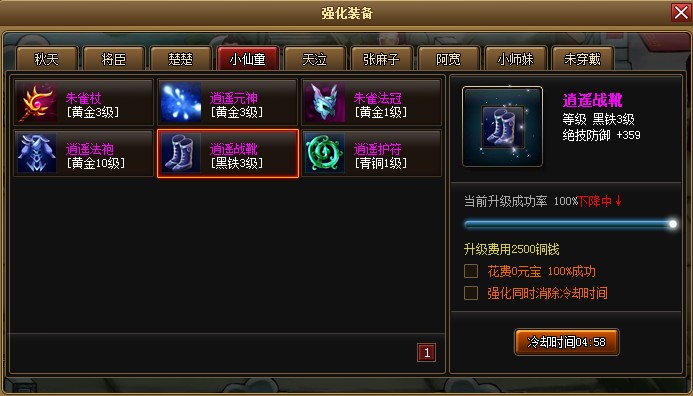 然后就是强化装备,开始的时间很短,到了后来时间是5分钟一次,如果你有心玩的话,可以每过5分钟就强化一次,强化几率是会一直随机更改的,不会随着强化等级更改。强化失败会返还一半的钱。