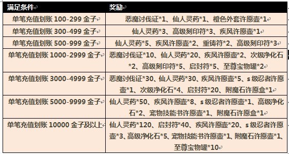 4、活动二中,累积充值划账奖励只能获得一次,且必须在单个服务器满足金额需求。如果用户A在8月4日之前全区全服历史累积充值划账30000金子,活动期间内在服务器A累积充值划账35000金子,将得到指定遁术套一套;用户B在8月4日之前全区全服历史累积充值划账50000金子,活动期间内在服务器A链接充值划账15000金子,在服务器B累积充值划账20000金子,将无法得到累积奖励;