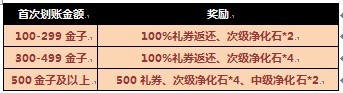 活动期间,充值服务器内首次充值达到100金子及以上即可100%礼券返还,最高返还达到500礼券!!同时更可获得净化石的超值好礼赠送!!!