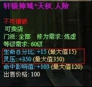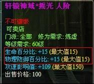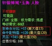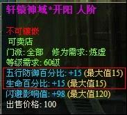 “轩辕神域”包括七种,每种除生命15%满外,另有一条满属性与一条 属性。(以下图片第三条属性为 ,仅供参考)