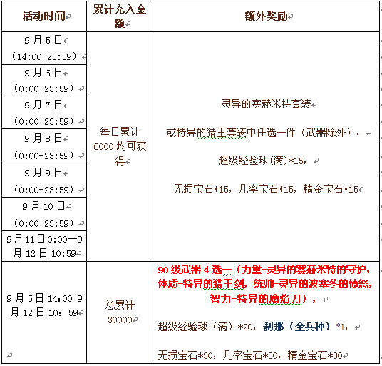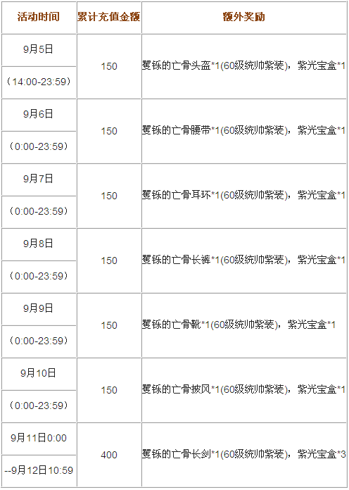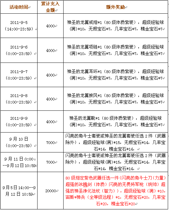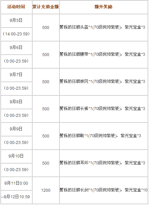 在本次活动期间(9月5日11:00—9月12日10:59)总累计金额达到相应额度,更可获得史诗80、90级紫色武器以及终极版兵种装备!
