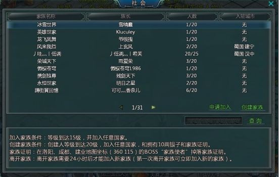 当玩家在脱离新手村后,就要选择一个势力加入了。游戏系统可能会推荐给大家一个势力,主要选择权还是玩家们自己来定夺。到达一定等级,我们还可以选择一个家族加入,日后能够跟着家族里的朋友一起升级、PK、交流经验。