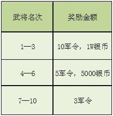 【活动内容】:在活动期间内,官方人员会每天查看武将排行榜,并根据排行榜上的武将排名对玩家发放奖励。每天取10位