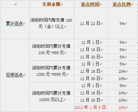2、活动结束后,活动期间累计充值满100元的用户,可分别在12月1日、12月16日、12月30日,获得本次活动期间内累计充值金额对应比例的点券反馈。活动期间累计充值满10000元的用户,在2012年1月5日还可获得活动期间充值金额一定比例的点券反馈。