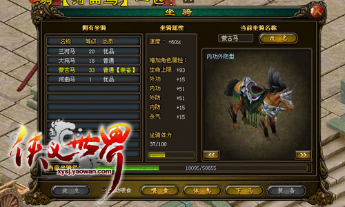 有了内外功法,自然还要有神兵利器。好的武器往往能让一个武者的实力翻上一倍不止,像金蛇郎君在有金蛇剑和没金蛇剑的状态完全就是两码事。而在要玩《侠义世界》中也是如此,除了玩家们可以通过打怪打副本来获得神兵利器之外,玩家们还可以通过对一些装备的鉴定和打造来获得更好的武器。同时在游戏中,坐骑对与玩家来说也十分重要,不同的坐骑也有不同的分法,像内攻内防坐骑,外攻内防等等。一只适合自己属性的坐骑,往往能起到事半功倍的效果。