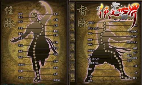 要玩侠义世界依照中医中的人体12大经脉,分别挑选了手太阳小肠经、手少阳三焦经、足太阴脾经、足少阴肺经作为游戏角色的四种基本能力,并引入除去正常经脉之外,督脉、任脉、冲脉、带脉、阴维脉、阳维脉、阴跷脉、阳跷脉、经外奇脉等奇经八脉以及其上195个穴位,当玩家们打通某个穴位,均可以激发一定的人体潜能,提升角色的属性。而按照冲穴规则和次序,每当完全冲开一条经脉时,还可获得这条经脉额外的属性点奖励。