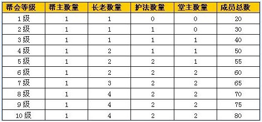 3、帮会具有等级的设定,消耗一定的帮会威望和帮会资金即可升级。帮会等级的提高可以拥有更高等级的帮会建筑,可以招纳更多的帮会成员,设置更多的管理职位。