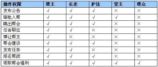 没有规矩不成方圆,帮中大小事务都需要有人来打点,不同职位的人所拥有的操作权限是不同的。让专业的人去做专业的事是个管理帮会的好方法。