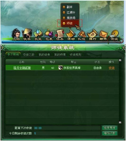 3、5次免费的收徒机会用完后仍可以选择使用元宝增加收徒次数。