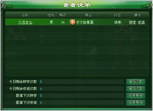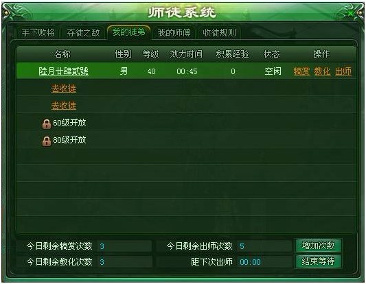 8、每天有5次让徒弟出师的机会,5次出师机会用完后,可以选择使用元宝增加使用出师功能的次数。