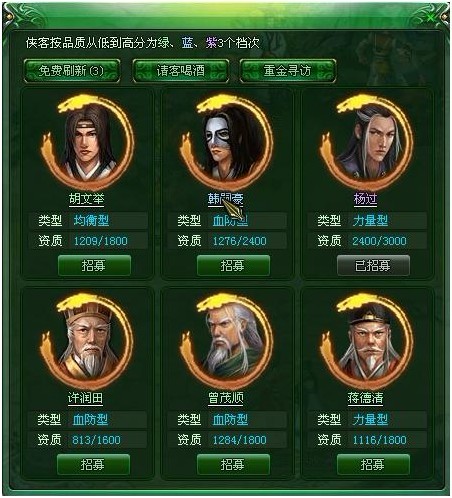 2、结识侠客有免费刷新、请客喝酒、重金悬赏三种方式,其中免费刷新间隔时间为1小时,每天只可进行3次,每天0点计数重置。