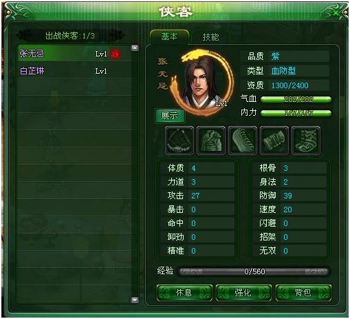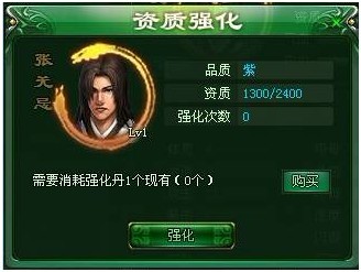 资质:影响侠客一级属性换算二级属性的系数,资质可通过强化功能提升,强化需要消耗指定道具;