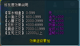 好友亲密度分5个等级:一面之交、心腹之交、忘形之交、莫逆之交、生死之交。不同的等级将带来不同的属性加成。