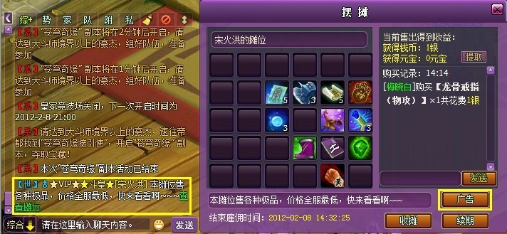可以在广告输入框中编写你摊位的个性宣传语句,再点击『广告』按钮,就会在世界频道发送了。