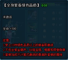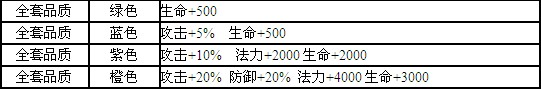 当玩家装备齐10件装备(除法宝、翅膀、时装)都品质都在绿色以上,可以激活对应的品质套装属性,获得额外的属性加成。