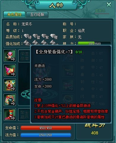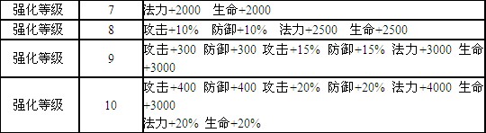 当玩家装备齐10件装备(除法宝、翅膀、时装)都强化到一定等级以上,可以激活对应的强化套装属性,获得额外的属性加成。