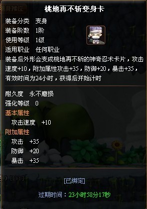 同样,桃地再不斩变身卡只有在击败狂暴状态下的BOSS再不斩后才可获得。请注意:击败普通状态下的BOSS再不斩或者其他变异情况下的BOSS再不斩是不能够获得【桃地再不斩变身卡】的哦!并且桃地再不斩变身卡将会限时24小时,获得后要记得尽快佩戴哦!