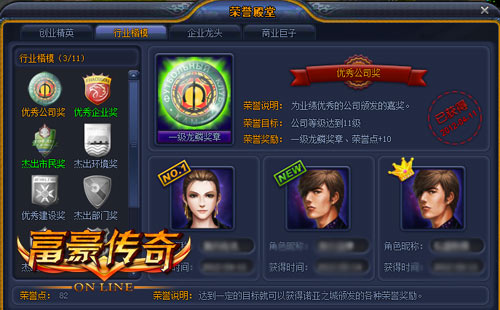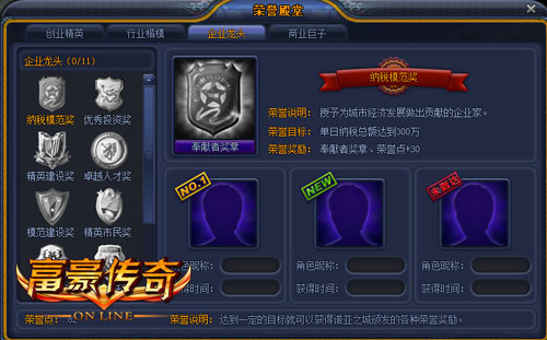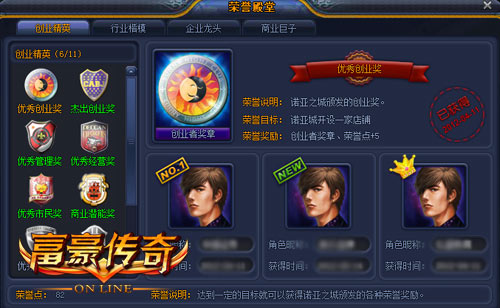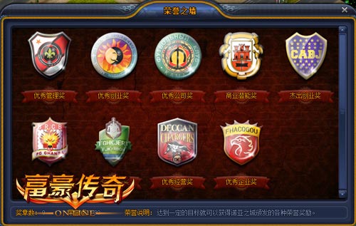 在要玩《富豪传奇》里有着多个荣誉奖项等着你们来拿!点击皇冠标志,你就能看到一面“荣誉之墙”,在墙上你就能看到挂着各式各样的奖项,包括优秀管理奖、优秀创业奖、优秀公司奖、商业潜能奖、 杰出创业奖、优秀市民奖、杰出市民奖、优秀经营奖、优秀企业奖。