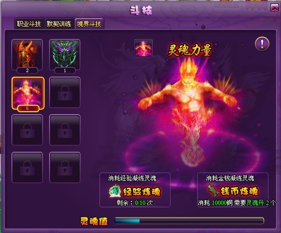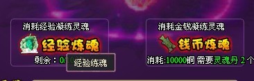 a、经验炼魂:通过消耗人物经验值,提升灵魂值,每天最多只可使用10次。