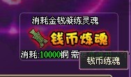 b、钱币炼魂:通过消耗非绑定钱币和灵魂丹,提升灵魂值。