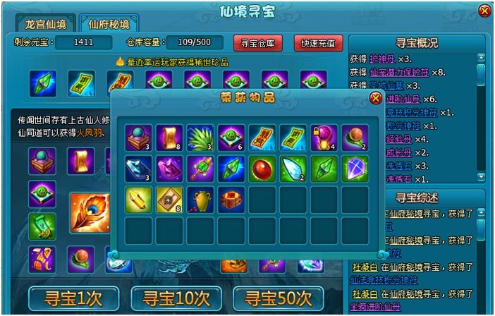 仙府秘境珍藏了极为珍贵的宝物,寻宝50次的奖励如图:
