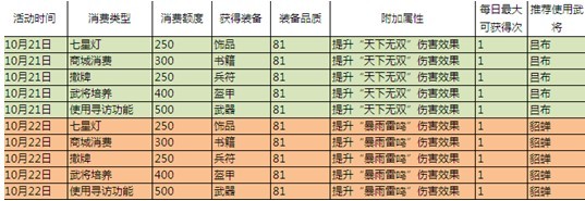 活动期间内消费各功能均可获得对应武将量身定做装备一件。