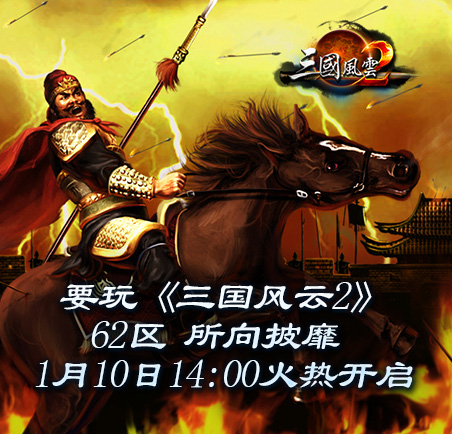 全国首款将策略游戏、角色扮演RPG、城防守卫三大特色融合的网页游戏——要玩《三国风云2》1月10日下午14:00震撼开启62区,让玩家享受多人在线的三国磅礴战争乐趣。