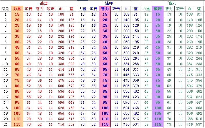 从上面的数据大家能看出来,在没有任何装备宠物技能的情况下三职业三属性总和一样,主属性数值和成长率一样,所以造成的攻击、血、蓝都一样。
