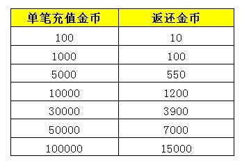 活动介绍:活动时间内,单笔充值金币满足以下条件即可获得金币返还,多次充值可以获得多次返还。