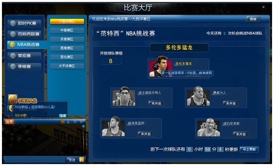 NBA挑战赛已经全新改版了,并且是按照NBA的六大赛区设置的,每天,各赛区会随机刷新一只NBA球队供玩家挑战,玩家每天拥有一次免费的挑战机会,并且,这些球队都是可以重复挑战的,根据NBA球队的强弱不同,胜利后可以获得不同的装备材料!