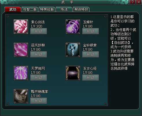 1、素心剑法,对单一敌人造成外功伤害,并一定几率增加自身外功攻击力2回合