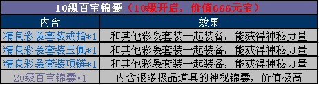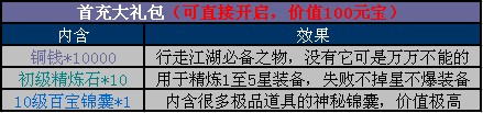 所有玩家首次充值,哪怕仅仅只是1元钱,均可获得1个首充大礼包,开启以后即可以免费获得10000铜钱和10个初级精炼石,此外还可额外获得一个10级百宝箱;等级达到10级即可花少量元宝换购超值大礼哦,最高可换购5份大礼包,累计价值3166元宝!