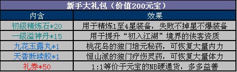 为了让广大初入江湖的少侠女侠们快速成长,我们特别准备了充足的“新手大礼包”,内含大量稀有道具,累计价值200元宝!实乃居家旅行敲闷棍、杀人放火那啥的必备之物。各位玩家可以通过我们的各种礼品码发放途径来获得。