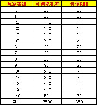 累计价值3500的礼券(礼券最高比例价值:1人民币=10礼券),350RMB能干什么?详细级别需求和可获得的奖励参见下表: