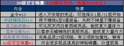 游戏开服后,玩家等级达到30级,即可通过任务“冲级小旋风”获得30级完美品质武器一件;达到40级更可通过任务“冲级王”获得40级完美品质武器一件。