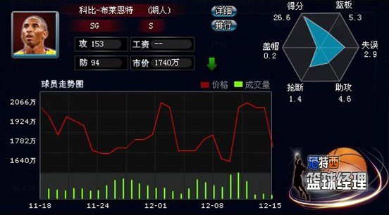 科比作为1996黄金一代优秀代表人物,在NBA14个赛季已经夺得了他职业生涯中所有能得到的荣誉,在科比的手上已经戴上了5枚总冠军戒指,科比是继乔丹时代后最为出色的一名得分后卫,很多的专家拿科比和乔丹做比较,有人说他已经超越了乔丹甚至超越了乔丹,科比在球场上被球迷戏称为“无限接近神的球员”可见他在球迷心目中那种王者的地位。突破、投篮、罚球、三分球科比都驾轻就熟,几乎没有进攻盲区,单场比赛81分的个人纪录就有力的证明了这一点。除了疯狂的得分外,科比的组织能力也很出众,经常担任球队进攻的第一发起人。另外科比还是联盟中最好的防守人之一,贴身防守非常具有压迫性。本赛季科比代表湖人出场25次在场均33内砍下26.6分5.3篮板4.6助攻1.4抢断0.2盖帽2.9失误2.1犯规。科比在中国拥有着一大批的铁杆球迷,在范特西篮球经理中这批科蜜撑起了科比在游戏中的市场。进入而立之年的科比在比赛中往往起起伏伏,而使其的属性并不像韦德杜兰特那样稳定,但是科蜜们并没有因为他的属性变成S而放弃装备他,科比现在在范特西中黑市中交易量非常的大,而且个个都是大手笔交易。虽然科比的属性比不上另外四名球员但是科比在现实中的表现和大批的支持者让他成为了当之无愧的NO.1