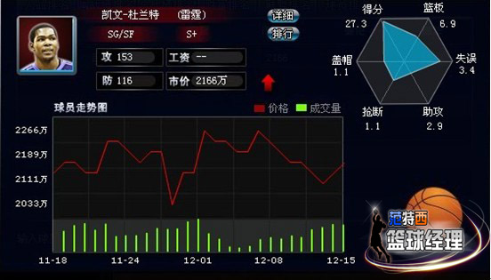 看到杜兰特在球场上的优异表现开拓者的高层一定后悔莫及,当初没有选择小杜,而选择了玻璃人奥登。让我们来看看杜兰特在NBA3年来的履历,07—08赛季最佳新秀,09-10当选为NBA联盟最年轻的得分王,2010年夏天代表美国国家队出征土耳其世锦赛帮助美国队夺得世锦赛冠军并成为了世锦赛的MVP。作为雷霆的领军人物,杜兰特依靠自己的表现使雷霆成为了联盟一线球队,让球迷记忆犹新的是09-10赛季季后赛和湖人的7场大战,年轻的雷霆一点没有怯场,反而给湖人带来了很大的麻烦。身高,运动能力,臂展,漂亮的中投,杜兰特具备所有这些素质。可以胜任场上的多个位置。打球非常的积极和富有攻击性,无论是突破到篮下得分还是跳投命中,杜兰特可以随心所欲的用他所喜欢的方式得分。不仅进攻出色,杜兰特的篮板和封盖能力同样不错。本赛季杜兰特依旧表现的抢眼,截至到今天杜兰特的得分依然高居联盟榜首,本季杜兰特代表雷霆出场21场在场均39.7分钟内砍下27.3分6.9篮板2.9助攻1.1抢断1.1盖帽3.4失误2.1犯规的全面数据。我曾经和许多玩家探讨在游戏中哪位球员是最稳定的这个问题,得到最多的答案就是杜兰特,的确在游戏中小杜的表现实在是无可挑剔,153的进攻116的防守让其在游戏的比赛中为玩家攻城拔寨,因为在游戏中詹姆斯是最强的小前锋所以很多玩家将杜兰特安排在得分后卫上。两名范特西中属性最高的球员在一起打球的确让玩家会非常的放心。范特西中杜兰特适应全部的战术,更有玩家学习美国队的战术将杜兰特放在大前锋的位置上。
