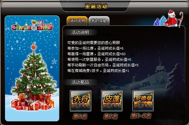 活动开启后,每个人在游戏主界面都可以得到一棵属于自己的圣诞树,您在游戏里的各项行为都将影响圣诞树的成长。