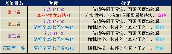 活动期间,累计充值前十名的玩家可获得超值大奖,第一名更可获得全服限量稀有定制侠客——真·小龙女侠客名帖一张。