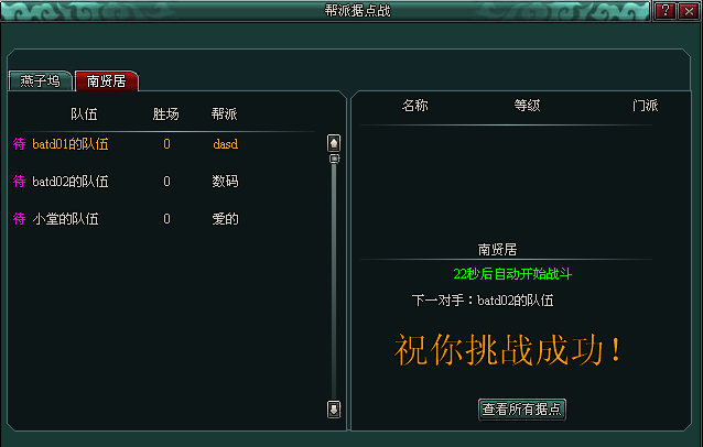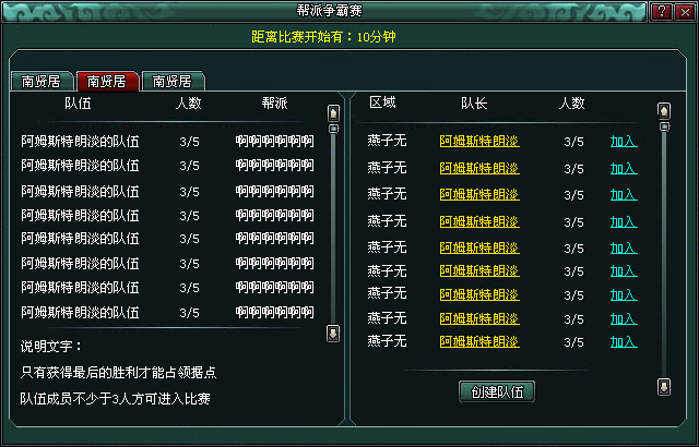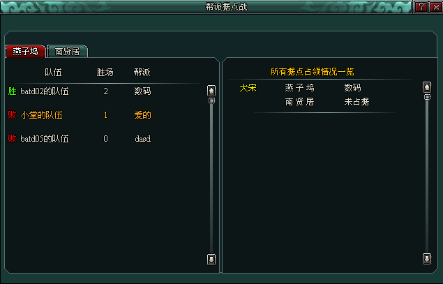 例如,在临安皇城处只显示大宋区域的据点,报名后可选择在燕子坞或南贤居进行队伍创建及比赛,并且各位只可以看到大宋区域据点内玩家创建队伍的情况,其他区域无法看到。如果想去争夺别的区域据点,则在大宋报名的据点自动退出。